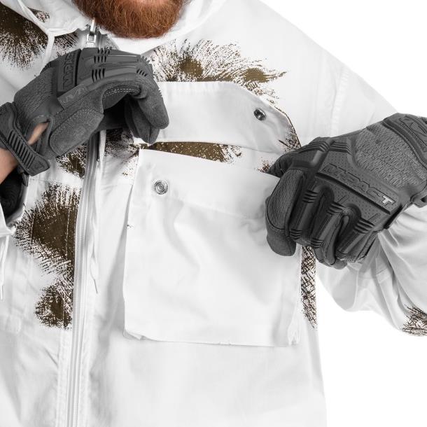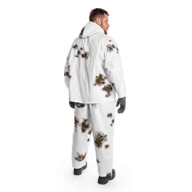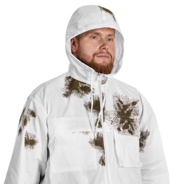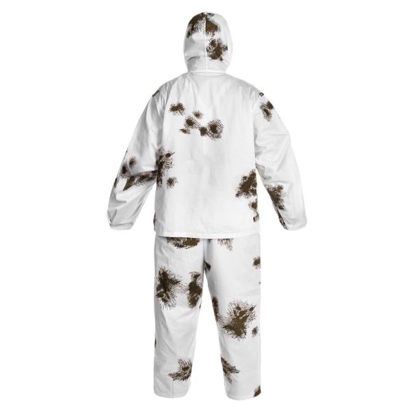 Зимний камуфляжный костюм Snow Camo состоит из толстовки и брюк. Камуфляж эффективно размывает силуэт и позволяет сливаться с окружающей средой. Капюшон обеспечивает маскировку и дополнительную защиту головы от холода и ветра. Толстовка застегивается на молнию. Оснащен одним внешним карманом на уровне груди и одним внутренним карманом. Регулируемые манжеты предотвращают задирание рукавов и облегчают посадку. Брюки оснащены двумя карманами, застегивающимися на молнию. Эластичный пояс и подтяжки позволяют лучше прилегать к телу. Молния на штанине позволяет легче и быстрее снять и надеть обувь. mil-tec
