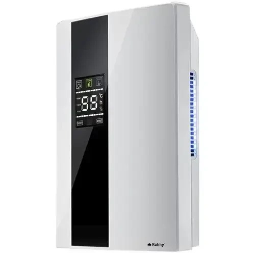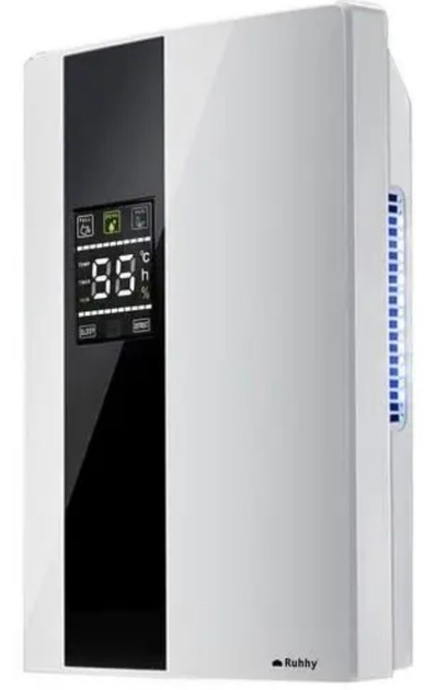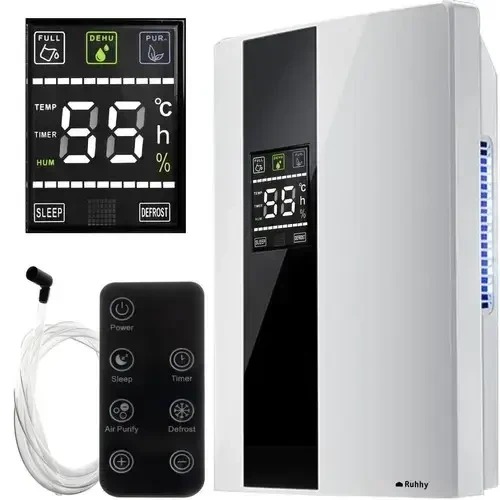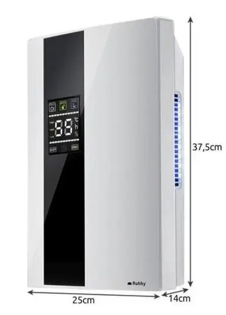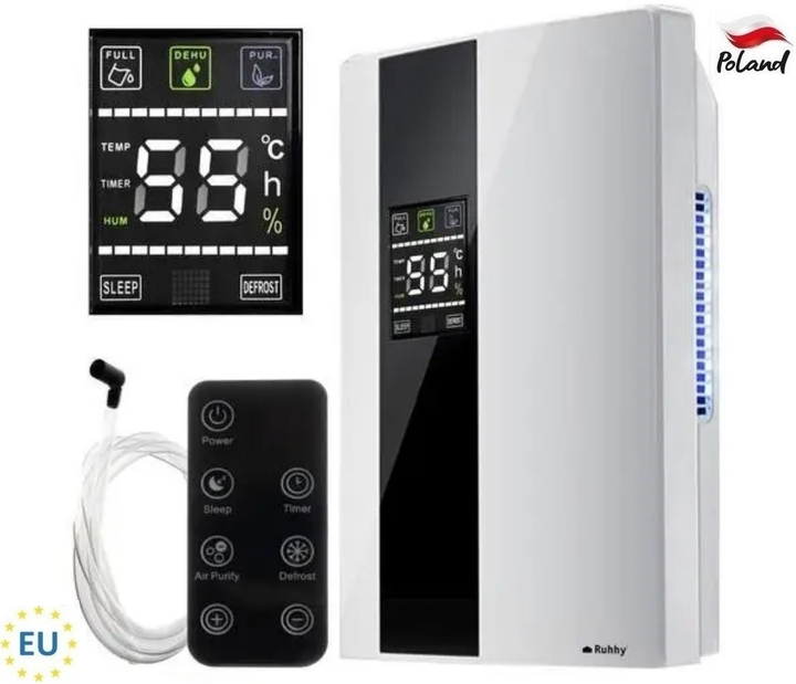 Осушитель воздуха Ruhhy с гигростатом, LCD-дисплеем и 24-часовым таймером – это чрезвычайно эффективное устройство для улучшения качества воздуха в помещении. Он поместится в любом доме или офисе. Благодаря гигростату можно автоматически настроить уровень влажности, а таймер и режим "Sleep" делают его еще более удобным и функциональным.Этот осушитель воздуха использует передовую технологию Пельтье, обеспечивающую высокую эффективность и низкий уровень шума. Гигростат позволяет настраивать уровень влажности воздуха от 40 до 70%, что обеспечивает автоматическое включение и выключение при достижении установленного уровня. Особенность осушителя заключается также в использовании технологии UV+TiO2 – это технология, использующая диоксид титана (TiO2) для очистки воздуха от загрязнений.Резервуар осушителя имеет емкость 1800 мл. Благодаря этому вам не придется время от времени выливать воду. Вы можете легко оставить осушитель дома более чем на два дня! Дополнительным преимуществом устройства является автоматическое отключение после заполнения бака. В набор также входит шланг, который можно подключить к осушителю и вывести воду, например, непосредственно к раковине. Это решение позволит вам оставить осушитель в редко посещаемом месте.Характеристики: Гигрометр: естьГигростат: естьТермометр: естьПодсвечивающийся LCD-дисплей: естьТаймер: 1-24 часаРежим SLEEP: естьДистанционное управление пультом: естьШланг для отвода воды: естьТехнология высушивания: модуль ПельтьеПоказатель наполненности резервуараМатериал: пластик/металлПроизводительность: 350 мл в суткиОбъем резервуара для воды: 1800 млРазмер комнаты: до 30 м?Уровень шума: 40 дБМощность: 90 ВтАвтоматическое отключение после заполнения резервуара: естьПодходит для: дома, офиса и т.д.Съемный резервуар для водыОткидная крышка резервуара для водыРучка для переноски: естьРазмеры: 37,5 x 25 x 14 смДлина кабеля: 1,5мВес: 1,75 кгВес в упаковке: 2,22 кг