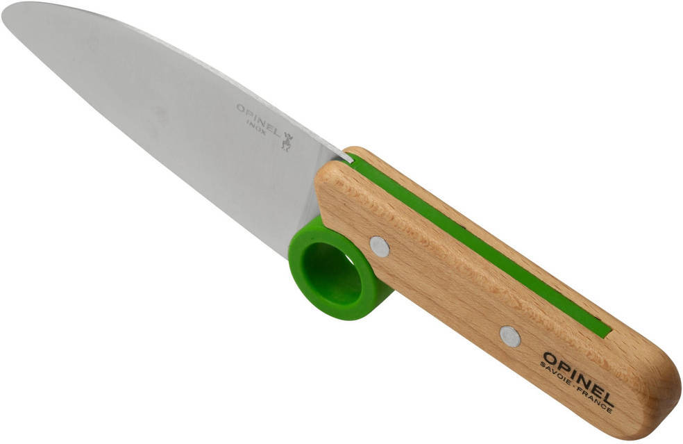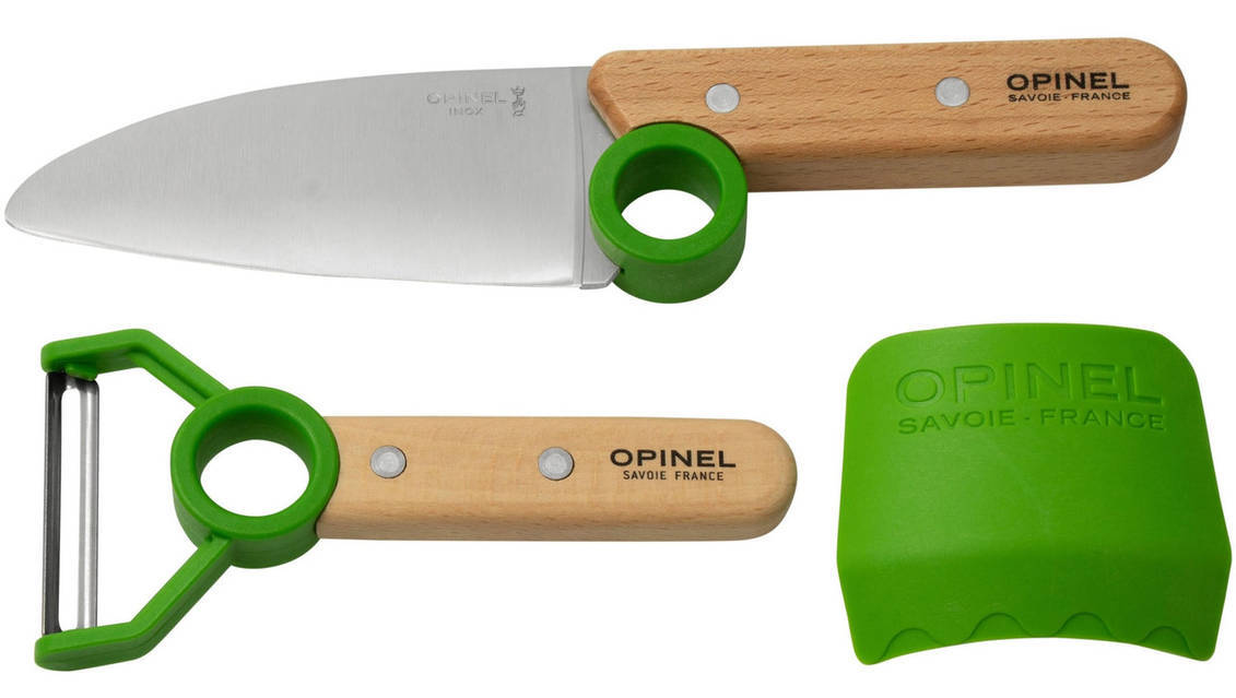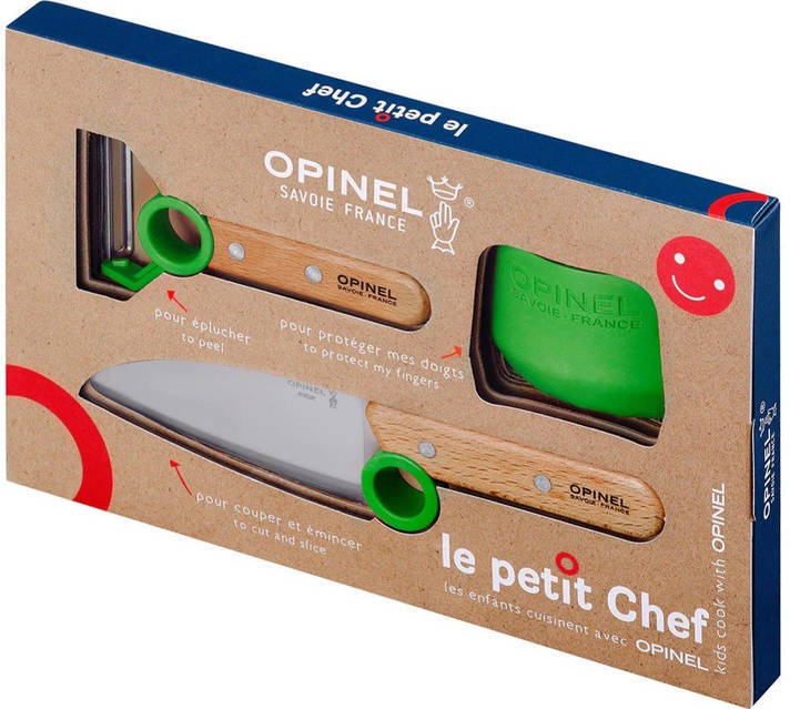 Набор кухонных ножей Opinel Le Petit Chef был разработан для будущих поваров. Opinel запустила эту линию специально для детей. В набор входят кухонный нож, овощечистка и защита пальцев. Этот красивый и маленький кухонный нож оснащен несколькими функциями безопасности, позволяющими вашим детям спокойно нарезать овощи. Пластиковое кольцо для указательного пальца делает практически невозможным неправильное удержание ножа, также учитывались пальцы другой руки. Защита пальцев ок. Размер 6,5 x 5,5 см делает резку независимо от остроты лезвия безопасной