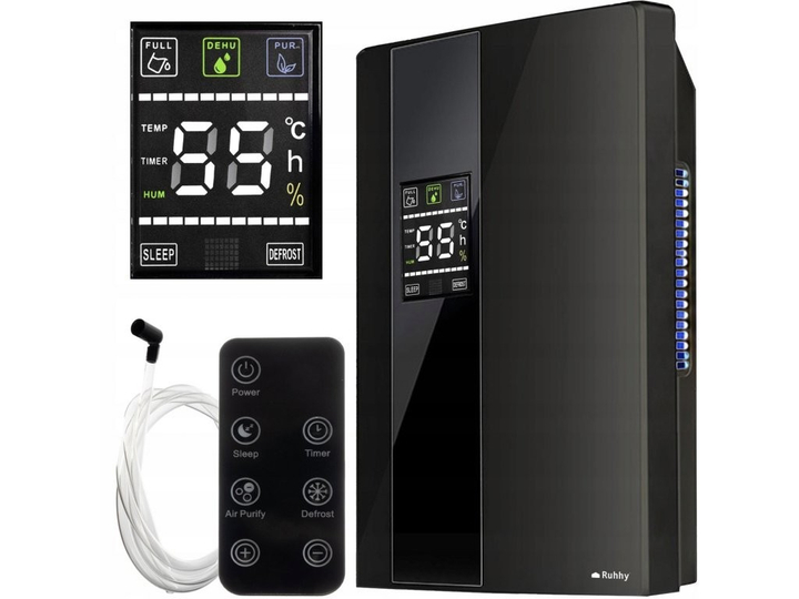 Осушитель воздуха с гигростатом, LCD-дисплеем и 24-часовым таймером - это чрезвычайно эффективное устройство для улучшения качества воздуха в помещении. Он использует технологию Пельтье и поместится в любом доме или офисе. Благодаря гигростату можно автоматически настроить уровень влажности, а таймер и режим "SLEEP" делают его еще более удобным и функциональным.Характеристики:Гигрометр: даГигростат: даТермометр: даПодсвечиваемый LCD-дисплей: даТаймер: 1-24 часаРежим "SLEEP": даДистанционное управление пультом: даШланг для отвода воды: даТехнология высушивания: модуль ПельтьеПоказатель наполненности резервуараЦвет: черныйМатериал: пластик/металлПроизводительность: 350 мл в деньОбъем резервуара для воды: 1800 млРазмер комнаты: до 30 м?Уровень шума: 40 дБМощность: 90 ВтАвтоматическое выключение после наполнения резервуара: даПодходит для: дома, офиса и т.д.Съемный резервуар для водыОткидная крышка резервуара для воды: даРучка для переноски: даРазмеры: 37,5 x 24 x 14 смДлина кабеля: 1,5 мВес: 1,75 кгВес в упаковке: 2,22 кгОсобенности:Этот осушитель воздуха использует передовую технологию Пельтье, что обеспечивает высокую эффективность и низкий уровень шума. Гигростат позволяет настраивать уровень влажности воздуха от 40% до 70%, что обеспечивает автоматическое включение и выключение при достижении установленного уровня. Особенность осушителя заключается также в использовании технологии UV+TiO2 для очистки воздуха от загрязнений.Комплектация:Осушитель воздухаРезервуар для водыШланг для отвода водыПульт дистанционного управления