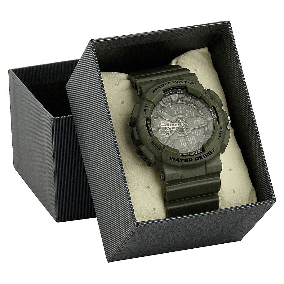 Спортивные часы, оснащенные аналоговым механизмом и цифровым дисплеем, заключенные в прочный и легкий корпус. Часы имеют класс водонепроницаемости 5 атмосфер (до 50 метров давления воды). Кнопки на конверте позволяют установить будильник, дату с месяцем и днем недели, а также запустить секундомер. Часы оснащены функцией подсветки, которая облегчает проверку времени при слабом освещении. Благодаря использованию больших кнопок часами можно управлять даже в толстых перчатках. Черный силиконовый ремешок обеспечивает удобство ношения и регулируется.