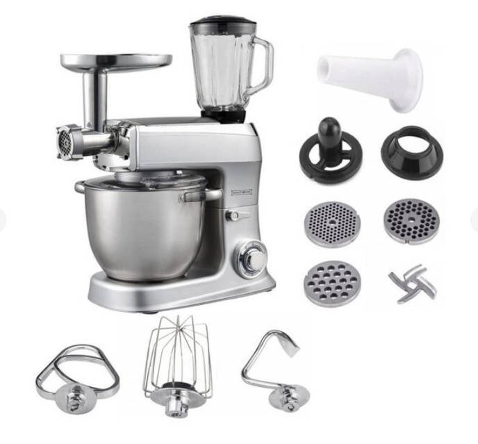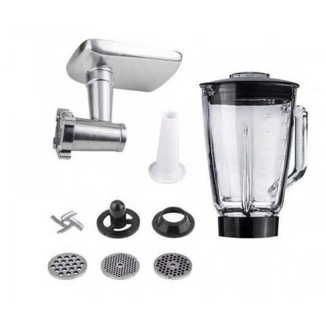 В комплекте стандартный набор насадок для мясорубки, крюк для замеса, насадка для взбивания и для непосредственного замеса теста. Мощность комбайна - 2100 Вт. 6 режимов работы, плюс режим пульсации и плавная регулировка. Кухонный комбайн работаем сравнительно тихо. В комплекте есть прозрачная защита от брызг, объем чаши блендера 1,5 л, есть мерочная шкала, объем чаши для замеса - 7,5 л. Мясорубку и блендер легко устанавливать. Комбайн быстро разбирается. У основания есть присоски, не допускающие скольжения комбайна по какой-либо поверхности.