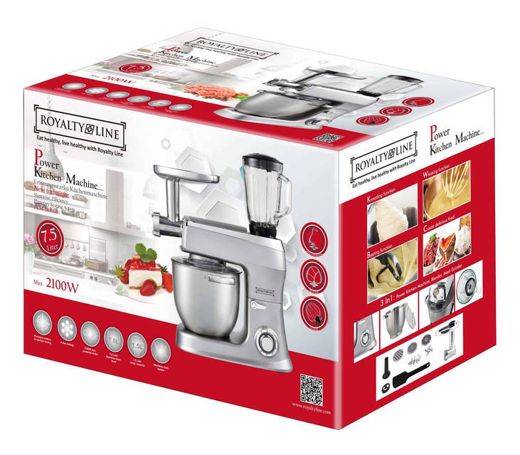 Характеристики Royalty Line RL-PKM2100BG SILVER:Эргономичный дизайн Материал корпуса – пластик Материал мясорубки и аксессуаров – нержавеющая сталь. Материал чаши для замеса – нержавеющая сталь. Материал защиты от брызг – акрил Материал чаши блендера – стекло Мощность – 2100 Вт Объем чаши блендера – 1.5 литра. Объем чаши для теста – 7.5 литра. 6 режимов работы Платная регулировка Три насадки для замеса теста Возможность добавления продуктов во время работы Защита от перегрузки Не скользящие ножки Упаковано в картон Взбивайте с удовольствием! С помощью блендера изготовленного из плотного стекла с мерной шкалой вы в считанные минуты можете приготовить смузи и коктейли для всей семьи или просто смолоть овсянку для домашнего овсяного печенья. Объем чаши достаточно большой – 1,5 литра, стальные ножи, острые. Чаша с носиком, таким образом, вам будет проще наливать содержимое в стакан. Фарш в считанные минуты! Торговая марка Royalty Line позаботились о том, чтобы Вы не покупали дополнительные дорогие кухонные принадлежности. В этом комбайне есть мясорубка, с помощью которой вы быстро справитесь с измельчением продуктов. Тесто для торта – легко и быстро! Благодаря емкой, 7,5 литровой чаше с тремя разными насадками для замеса теста и приготовления кремов – это стало настоящим удовольствием. Вы можете без лишних усилий смешать ингредиенты для торта, печенья или соуса и радовать свою семью вкусной, домашней выпечкой, более того, время на ее приготовление у вас значительно сократится. Кухонный комбайн Royalty Line это многофункциональный бытовой прибор, который быстро справится с как с приготовлением коктейля, так и с замесом теста. Он выполнен из высококачественных материалов. Современный дизайн, прибор легко разбирается, не требователен в уходе. Модель идет в трех цветах – красный, черный и серебристый.