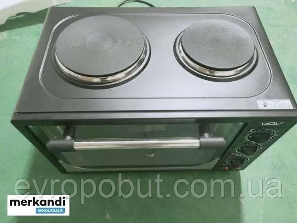 Характеристики VOV VEOHP-30L:Об'єм: 30 літрів Розмір: 55 x 38,6 x 35 см Потужність: 1000 Вт + 700 Вт для варильних панелей Нагрівальна нитка з нержавіючої сталі Ручка з нержавіючої сталі Окрема лампа робочого дисплея Регульований термостат від 50 до 250 ?C Кнопки контролю температури Одночасне використання духовки та варильних панелів Гриль Випічка Вага: 8 кг Внутрішні розміри: Ширина: 37,5 см Довжина: 31 см Висота: 25 см Розмір лотка: 37,5 x 27 см