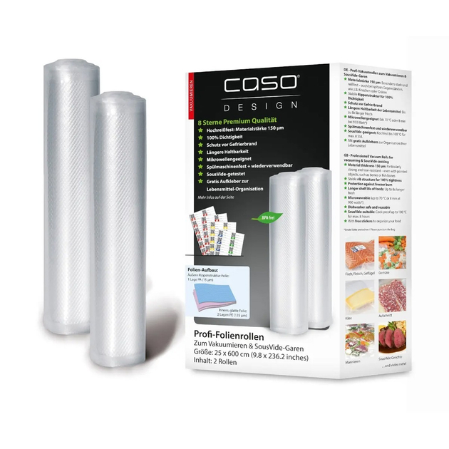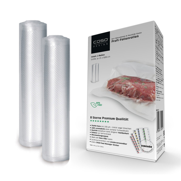 Пленка для вакууматора CASO rolka foliowa 1225 (CASO1225) 25x600 см 2 рулона CASO rolka foliowa 1225 (CASO1225) - это прочная и надежная пленка для вакууматора, которая поможет вам сохранить свою пищу дольше и обеспечит максимальную защиту от воздуха и влаги. Этот набор содержит два рулона пленки размером 25x600 см каждый, что позволяет эффективно упаковывать продукты любого размера и формы. Благодаря толщине материала 150 микрон, эта пленка отличается особой прочностью и стойкостью к разрывам, даже при контакте с острыми предметами, такими как кости. Стабильная реберная структура обеспечивает 100% герметичность, что гарантирует максимально эффективное удержание воздуха вдали от ваших продуктов. Эта пленка позволяет сохранять пищу дольше, сохраняя ее свежесть и вкус. Вы также можете использовать ее для приготовления продуктов методом sous vide, поскольку она устойчива к кипению при температуре до 100°C в течение 8 часов. С набором CASO rolka foliowa 1225 вы получаете бесплатные наклейки Food Manager, которые помогут вам организовать и пометить свои продукты по дате и весу. Эта пленка подходит для всех вакуумных запаивателей CASO и многих других брендов, что делает ее универсальным и практичным выбором для любой кухни. Добавьте эффективность и сохранение к вашему кулинарному опыту с CASO rolka foliowa 1225.Преимущества пленки для вакууматора CASO rolka foliowa 1225:Прочность и устойчивость к разрывам: Пленка имеет толщину 150 микрон, что делает ее очень прочной и устойчивой к повреждениям даже при контакте с острыми предметами, такими как кости. Вы можете быть уверены, что ваша еда останется целой и неприкосновенной.Герметичность: Пленка имеет стабильную реберную структуру, которая обеспечивает 100% герметичность. Это гарантирует отсутствие доступа воздуха и влаги к вашим продуктам, что обеспечивает более длительный срок хранения и сохраняет вкус и качество пищи.Специально для sous vide: Пленка подходит для метода приготовления пищи sous vide и устойчива к кипению при температуре до 100°C в течение 8 часов. Это делает ее идеальным выбором для шеф-поваров и всех, кто ценит изысканный вкус и еду.Многократное использование: Пленку можно мыть в посудомоечной машине и использовать снова и снова, что делает ее экономически выгодным вариантом.Наклейки Food Manager: Вы получаете бесплатные наклейки Food Manager, которые помогут вам организовать и пометить свои продукты по дате и весу. Это облегчает контроль над хранимой пищей и делает процесс кулинарии более организованным.Совместимость со многими вакуумными запаивателями: Пленка подходит для использования со многими вакуумными запаивателями, включая CASO и другие известные бренды. Это делает ее универсальным и удобным выбором для любой кухни.