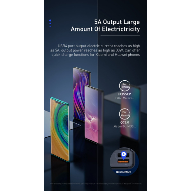 Мощность: Выход USB4 Type-A QC3.0+SCP: 5V/4.5A, 4.5V/5A, 5V/3A, 9V/3A; 12V/2.5A 20V/1.5A 30W