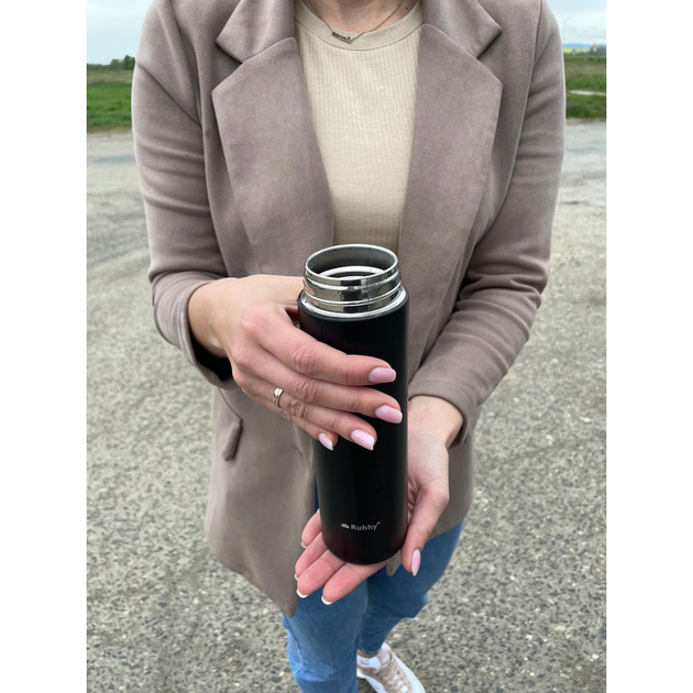 Термокружка 500 мл с индикацией температуры Измерение температуры: Эта уникальная термокружка позволяет контролировать температуру жидкости внутри благодаря встроенному LED дисплею на крышке. Одного прикосновения достаточно, чтобы узнать текущую температуру напитка. Кружка сохраняет жидкости горячими или холодными до 8 часов. Материал: Изготовлена из высококачественной нержавеющей стали, термокружка устойчива к коррозии и легко моется. Двухслойная вакуумная конструкция обеспечивает оптимальные термические свойства и сохраняет тепло или холод. Практичная крышка с ситечком: В комплекте имеется съемное ситечко, что позволяет использовать термокружку для заваривания чая или кофе без необходимости дополнительного процеживания. Ситечко надежно задерживает мелкие частицы напитка. Портативность: Объем 500 мл и компактные размеры (6,5 х 6,5 х 23 см) делают термокружку идеальной для путешествий, использования в офисе, автомобиле или школе. Она легко поместится в небольшой рюкзак или сумочку. Технические характеристики: Цвет: черный Материал: нержавеющая сталь, силикон, PS LED дисплей Размеры: 6,5 х 6,5 х 23 см Вес: 0,246 кг (в упаковке: 0,297 кг) Преимущества: Измерение температуры жидкости Ситечко в комплекте Объем 500 мл Идеально подходит в качестве подарка Поставляется в эстетичной подарочной коробке Бренд: Ruhhy