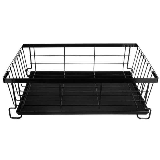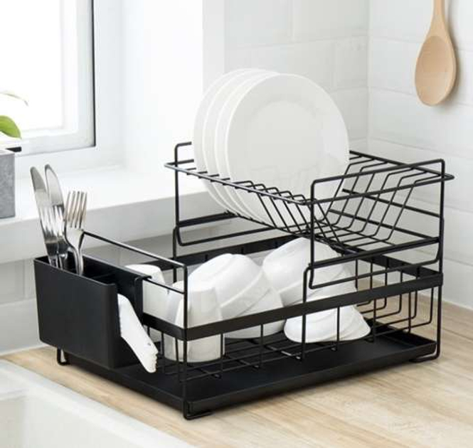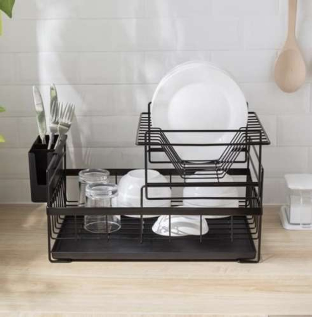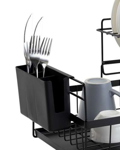 ВИСОКА ЯКІСТЬ - сушарка виготовлена ??з високоякісного хромованого металу, завдяки чому вона стійка до пошкоджень і надмірної вологи. Має дизайн в стилі лофт, що дозволить вписати його в будь-який інтер'єр. LOFT - сучасний, елегантний loft look зробить сушарку окрасою Вашої кухні! У набір входить знімна ємність для столових приборів, просто повісьте її на бічні стійки сушарки. ЇЇ можна розмістити в будь-якому місці на стільниці. Основа сушарки для столових приборів і основний піддон для води виготовлені з чорного міцного пластику. Крім того, універсальний чорний колір впишеться в будь-який інтер'єр. ДВОРІВНЕВА - сушарка складається з двох рівнів. Перший рівень – місце для мисок і тарілок. З лівого боку є сушарка для столових приборів. Другий рівень – це прибудова, яка має аж 9 місць для тарілок. СУШКА ДЛЯ СТОЛОВИХ ПРИБОРІВ - дворівнева ємність для посуду також оснащена практичним контейнером для столових приборів. Поділ на 2 відділення дозволяє легко сортувати ложки, виделки та ножі. Виріб полегшує утримання кухні в порядку.