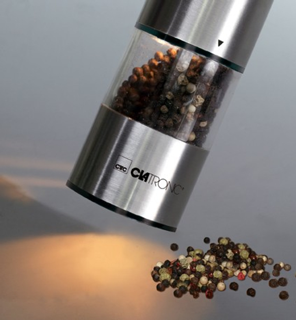 Электрическая мельница для перца / соли Clatronic PSM 3004 N нержавеющая стальМельница для перца / соли - измельчает благодаря высококачественной прецизионной керамической мельнице. Регулируется и позволяет измельчать ингредиенты от грубого до тонкого.Высокое качество и современность - благодаря корпусу из высококачественной нержавеющей стали и неподвластному времени дизайну мельница привлекает внимание любой кухни.Главная особенность - устройство имеет подсветку для оптимальной дозировки количества специй.Характеристика:высококачественная точная керамическая мельницарегулируемая керамическая мельница (от крупной до мелкой)стабильное качество помолалегко пополнятьоперация одной рукойкорпус из нержавеющей сталиразмер упаковки (В?Ш?Г): 23 ? 5 ? 5 смвключая свет для оптимальной дозировки количества специйблок питания: 4 x 1,5 В / AA / Mignon / LR / AM3 (не входят в комплект)