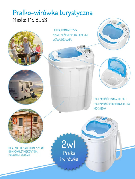 Полуавтоматическая стиральная машинка Mesko MS 8053 – станет великолепной альтернативой для ухода за вещами, где нет возможности подключения к централизованному водоснабжению. Идеально подходит для небольших квартир, дач, во время путешествия, а также дальних поездок с семьей, благодаря своей компактности и небольшому весу. Максимальная мощность при стирке – 400 Вт, что более чем достаточно для стирки одежды, используемой во время занятий спортом или работы в саду. Номинальная мощность: 150 Вт. Продолжительность стирки: 15 мин. Максимальная мощность центрифуги – 580 Вт. Для стирки – емкостью 3 кг и для отжима выстиранного белья – емкостью 1 кг. Преимущество стиральной машины – низкое потребление воды и энергии. Стиральная машина весит всего 5 кг, но может стирать до 3 кг одежды. Стиральная машина, предназначенная для потребления как можно меньше воды и энергии, является хорошим оборудованием для тех, кто ценит чистоту и активность одновременно. Также имеет функцию отжима, которую можно использовать после стирки одежды и слива воды. После стирки грязную воду следует слить из стиральной машины, опустив сливной шланг, и вы можете переложить одежду в камеру центрифуги. После отжима просто развесьте одежду.