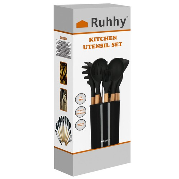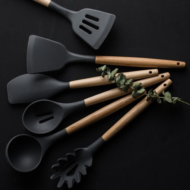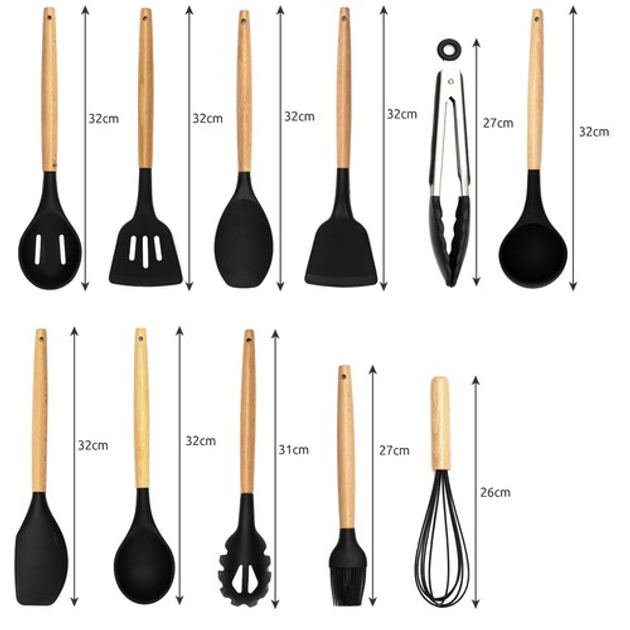 БОЛЬШОЙ НАБОР - весь набор состоит из 12 элементов. Каждый инструмент служит разным целям. Есть лопатки, черпаки, макаронник, венчик, ложки, щипцы и кисточка. ТЕМПЕРАТУРНОСТОЙКИЙ СИЛИКОН - стоит помнить, что силиконовая кухонная посуда устойчива к высоким температурам, максимальная температура, при которой можно использовать посуду - до 230 градусов. ГНУЩИЙ И НЕЖНЫЙ - силикон - это гибкий материал, который не царапает поверхность посуды или сковородок. Силиконовые инструменты бережно воздействуют на покрытие посуды, кастрюль и сковородок, не царапают и не повреждают поверхность. ПРОЧНЫЙ - силикон является очень прочным материалом, благодаря чему наши аксессуары устойчивы к механическим повреждениям, легко чистятся и долговечны в использовании. Они не ломаются, не деформируются и не выцветают. СПЕЦИФИКАЦИЯ цвет: черный материал: дерево / силикон длина устройства: 32-26 см вага: 827 г вес в упаковке: 953 г ВКЛЮЧЕНО шпатель с отверстиямишпательлопатка для торташпатель с закругленной сторонойложкашумовка с отверстиямиложка макаронкисточкащипцычерпаквенчикконтейнер для столовых приборов