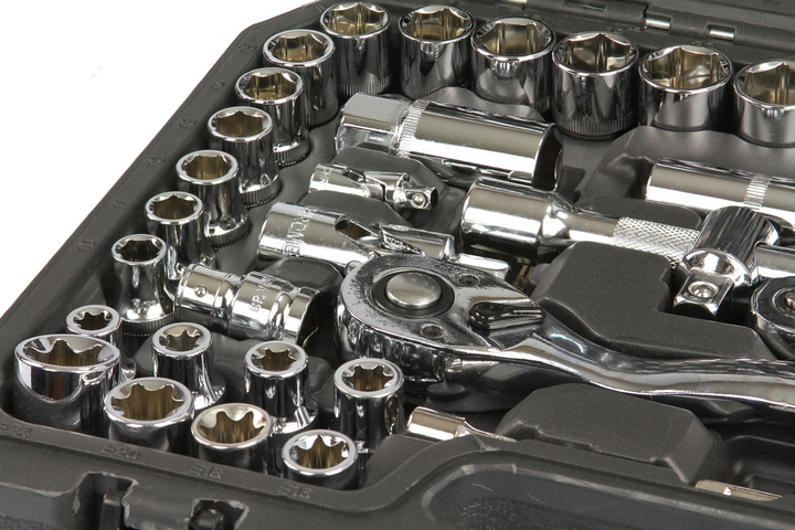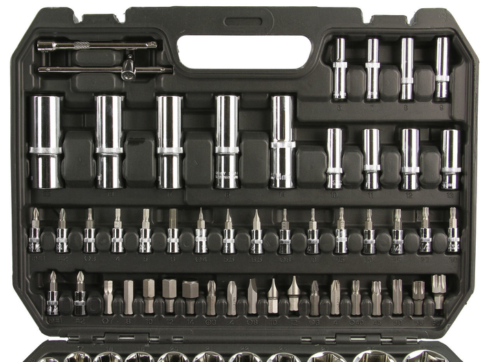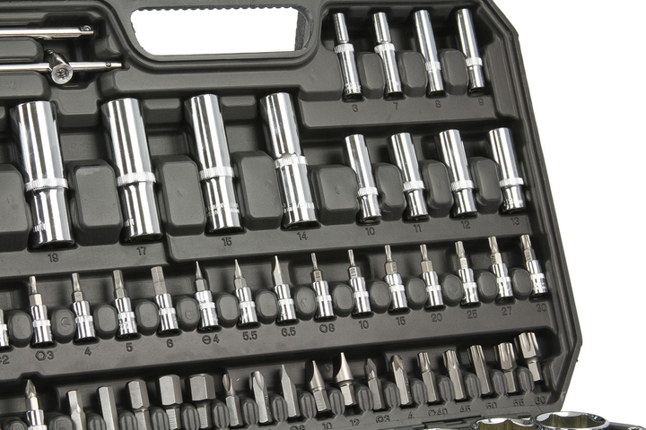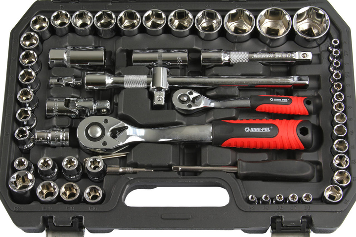 НАБОР КЛЮЧЕЙ 108 ЭЛ. MAR-POL ПРОФЕССИОНАЛЬНАЯ СТАЛЬ CrV Ключи изготовлены из специальной усиленной CrV стали с примесью хрома и ванадия. В набор входит все необходимое для домашнего мастера или автолюбителя. ? ?Этот набор для всех, кто ценит изделия из настоящей армированной стали. ?Зачем тратить время на покупку дешевых наборов, которые становятся бесполезными после непродолжительного использования? В результате мы платим больше, потому что нам приходится покупать еще один комплект. ? ?Комплект ключей MAR-POL Professional – гарантия удовлетворения качеством и долговечностью. В чемодане вы найдете, среди прочего: торцевые ключи, прецизионные отвертки и многое другое. Чемодан спроектирован и изготовлен из высококачественного пластика с металлическими защелками. Почему стоит выбрать ключи MAR-POL M58222? Что отличает этот набор ключей, так это качество изготовления. Справа мы видим обычную, типичную розетку, продающуюся в продаже, супер-качества, но если сравнить ее с розеткой из нашего набора, то даже непрофессионал заметит разницу в качестве изготовления в пользу точно изготовленных нами розеток. Если вам нужен достойный набор, выбор очевиден. Уникальный дизайн + обслуживание Уникальная конструкция храпового механизма с 72 зубьями обеспечивает более высокий крутящий момент, что упрощает и ускоряет работу с ключами. Продвинутая система обслуживания Трещотки в нашем наборе полностью разборные, а значит, их можно обслуживать и ремонтировать. Состав набора MAR-POL PROFESSIONAL: Головки 1/2 дюйма: 10, 11, 12, 13, 14, 15, 16, 17, 18, 19, 20, 21, 22, 24, 27, 30, 32 мм. Головки длиной 1/2 дюйма: 14, 15, 17, 19, 22 мм. Свечные патроны 1/2 дюйма: 16, 21 мм. Головки 1/4 дюйма: 4, 4,5, 5, 5,5, 6, 7, 8, 9, 10, 11, 12, 13, 14 мм. Головки длиной 1/4 дюйма: 6, 7, 8, 9, 10, 11, 12, 13 мм. Головки 1/4" с битами: Торкс (Т8, Т10, Т15, Т20, Т25,Т27, Т30) Шестигранный ключ (3, 4, 5, 6 мм) ПО (1, 2) РН (1, 2) Плоский (4, 5,5, 7 мм) Биты: Шестигранный ключ (6, 8, 10, 12, 14 мм) РН (3, 4) Плоский (8, 10, 12 мм) ПО (3, 4) Торкс (Т40, Т45, Т50, Т55) Отвертка 1/2 дюйма для головок и бит. Адаптер для бит 1/2" Трещотки 1/2" и 1/4" Удлинители 1/2 дюйма (125, 250 мм) и 1/4 дюйма (50, 100 мм) втулка 1/2 дюйма Ручка Т-образного типа с квадратом 1/4 дюйма. Карданные шарниры 1/2" и 1/4" Шестигранные ключи типа L (1,5, 2, 3 мм) Внутренние головки TORX (E4, E5, E6, E7, E8, E10, E11, E12, E14, E16, E18, E20, E24)
