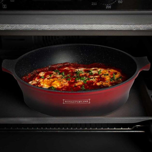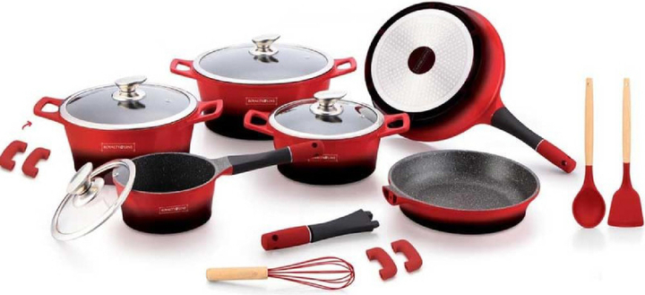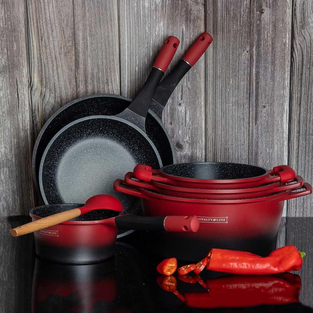 Каждая хозяйка преимущественно останавливает свой взгляд не только на высококачественной, но и на красивой посуде. Именно такую предлагает торговая марка Royalty Line. Модель RL-ES1014M состоит из четырнадцати предметов. В наборе три кастрюли разного диаметра, сотейник для приготовления небольших порций еды и две сковородки. Изготовлена посуда из литого алюминия, что делает ее не только прочной и надежной, но и отлично проводящей тепло, благодаря чему сокращается время приготовления пищи. Внутреннее покрытие - мраморное, антибактериальное. Такой тандем способствует тому, чтобы пища не налипала ко дну и стенкам посуды. Крышки изготовлены из жаропрочного стекла, ободок из нержавеющей стали, есть отверстие для выхода пара. Данная посуда подходит для приготовления на всех типах плит, включая индукционные и галогенные. Более того, RL-ES1014M полюбилась хозяйкам еще и тем, что она подходит не только для варки и тушения, но и для запекания в духовом шкафу. Сковородки и сотейник счастливые обладатели съемных ручек, что безусловно удобно в ходе хранения посуды.