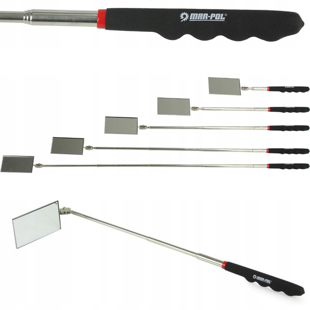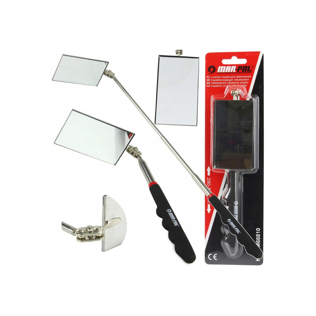 Телескопическое смотровое зеркало с регулирующим элементом в стыке. Это позволяет установить зеркало под любым углом. Зеркало крепится на телескопической штанге (290-890 мм).