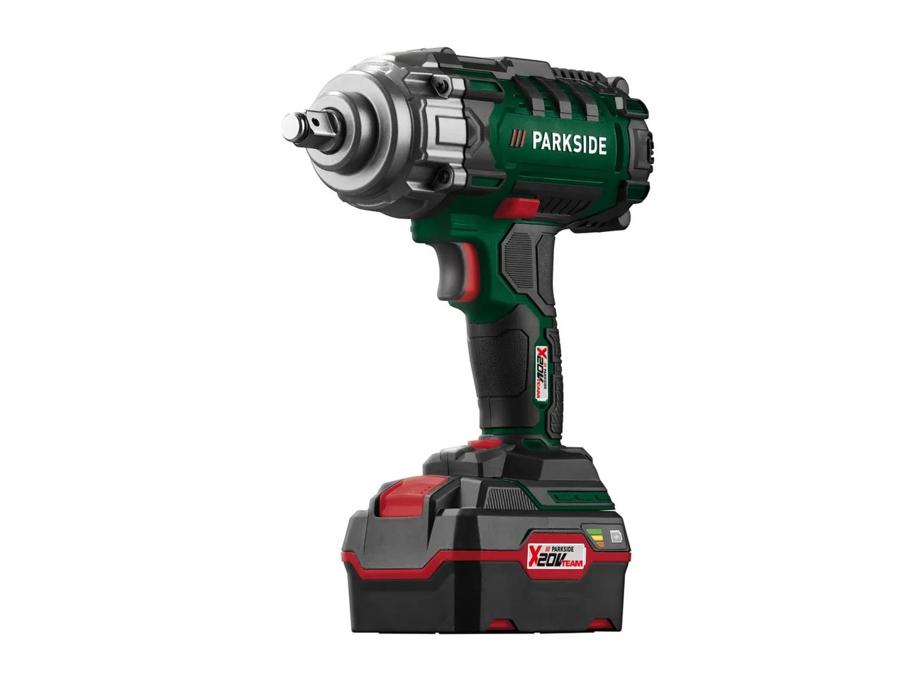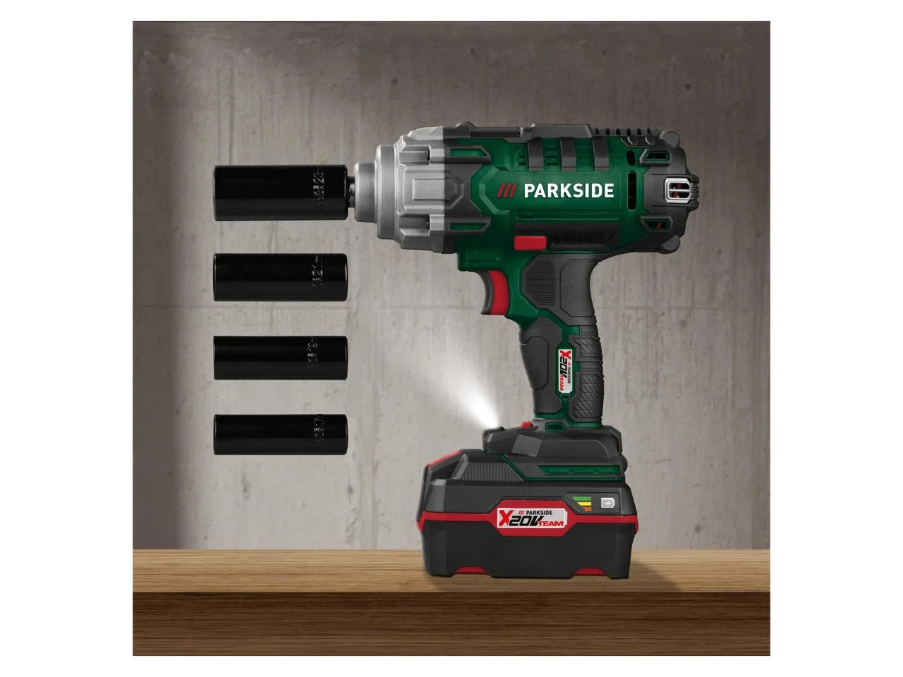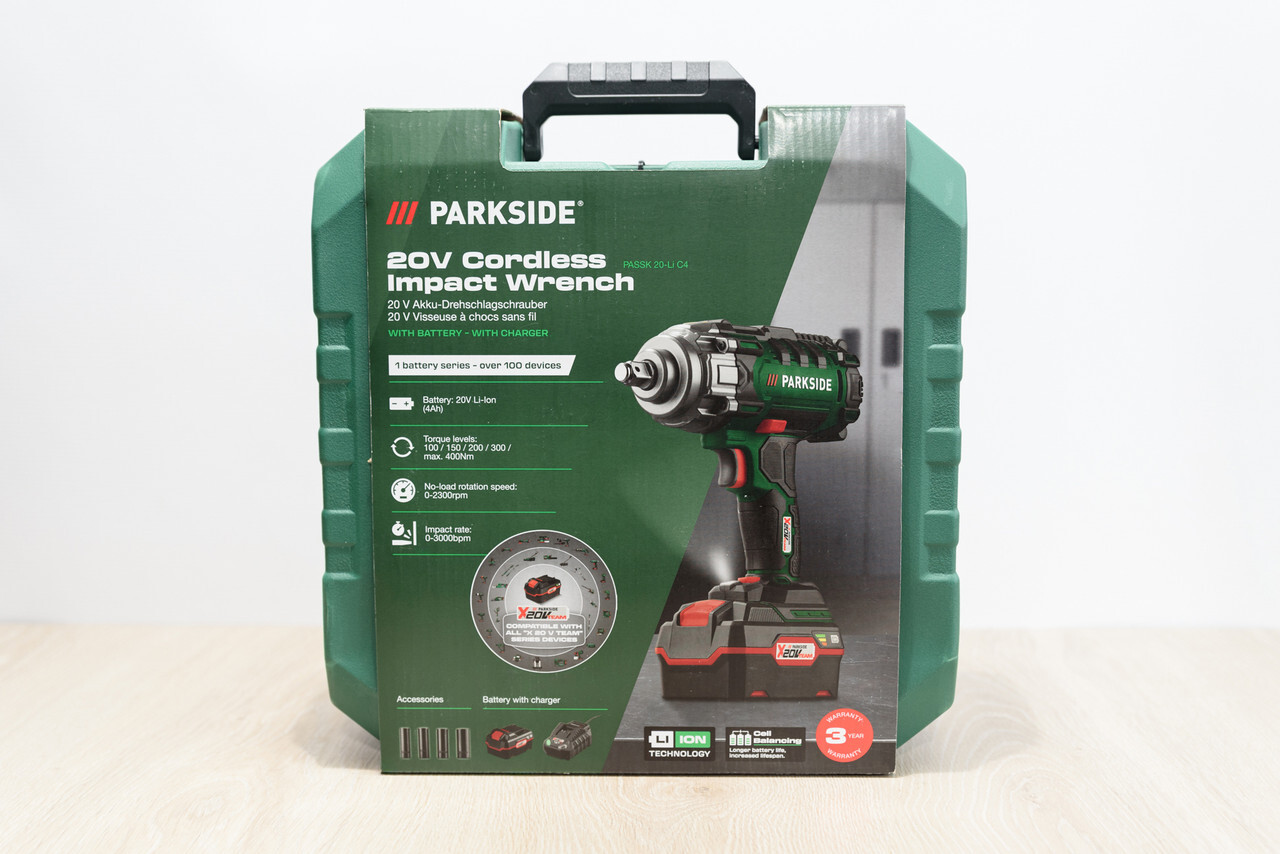 Характеристики Parkside PASSK 20-LI C4:Мощный ударный гайковерт для крепления колес легковых автомобилей Плавная регулировка количества ходов/оборотов 5 предварительно установленных уровней крутящего момента: 100 / 150 / 200 / 300 / 400 Нм (включая функцию памяти) Эргономичная рукоятка с нескользящей мягкой поверхностью и практичным зажимом для пояса Встроенный светодиодный рабочий свет Ручка и корпус с нескользящей и мягкой поверхностью Практичный футляр для хранения Комплектующие: 4 торцевых ключа (17/19/21/23 x 75 мм) Технические характеристики: Крутящий момент: макс. 400 Нм Выбор крутящего момента: 5 ступеней (100 / 150 / 200 / 300 / 400 Нм) Холостого хода: 0-2300 мин-1 Количество обращений: 0-3000 -1 Квадратный зажим: ?? Время работы: примерно 50 мин (аккумулятор 4Ah) / примерно 100 мин (аккумулятор 8Ah) Рекомендуемый аккумулятор: 20 В (4 Ач) Размеры: Инструмент: примерно 22,3 x 22,8 x 9,7 см Кейс: примерно 30,5 х 29,1 х 12,5 см Вес: Инструмент: примерно 1,88 кг Кейс: примерно 1 кг