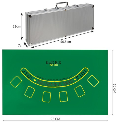 СПЕЦИФИКАЦИЯ - материал корпуса: алюминий; размеры чемодана (длина/ширина/высота): 56,5/7/22см; размеры ткани (ширина/высота): 95/60см; вес 1 жетона: около 10 г; вес набора с упаковкой: 8,4 кг.