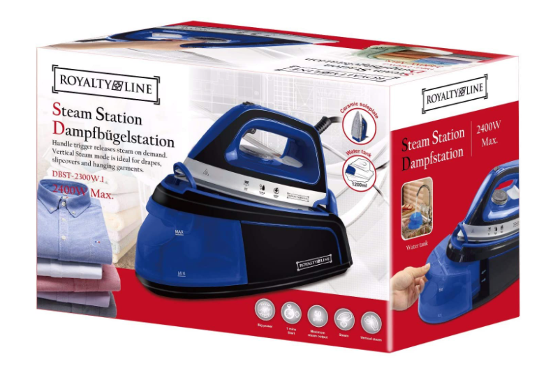 royalty lineПаровая станция Royalty Line RL-DBST-2300 2300 Вт - это удобный парогенератор, который на раз справится с горой белья. Время нагревания 2 минуты. Он высоко функциональный. Выполнен в бело-синем цвете.